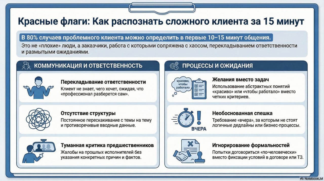 👨💻 Когда работа ВЫМАТЫВАЕТ, хотя клиент «вроде нормальный» Иногда бывает так: клиент адекватный, не хамит, платит вовремя — и формально к сотрудничеству вообще не придраться. НО! После каждого созвона ловишь себя на странном желании —